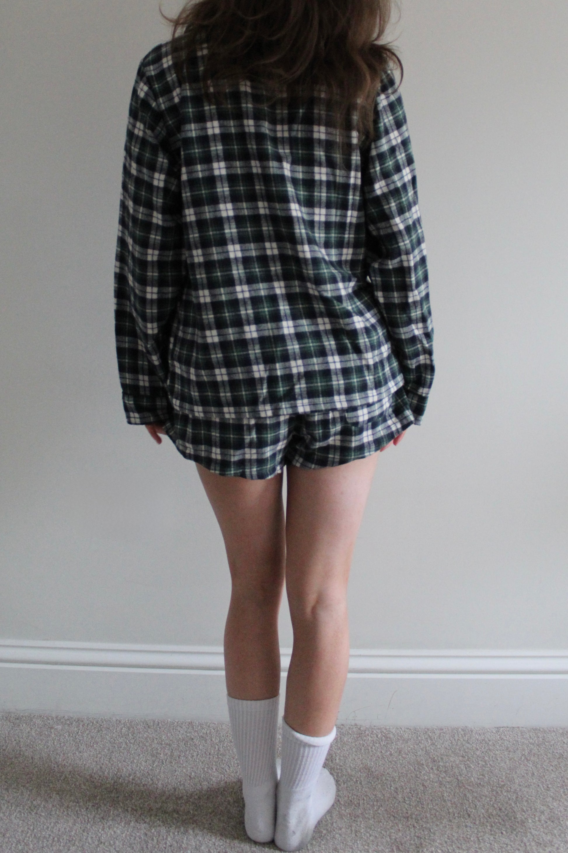 Featuring a deep forest green and navy checkered pattern, these shorts blend classic design with modern cuts. The shorts include a back pocket, accented with a subtle embroidered logo, the shirt includes a chest pocket with the same embroidered detail.