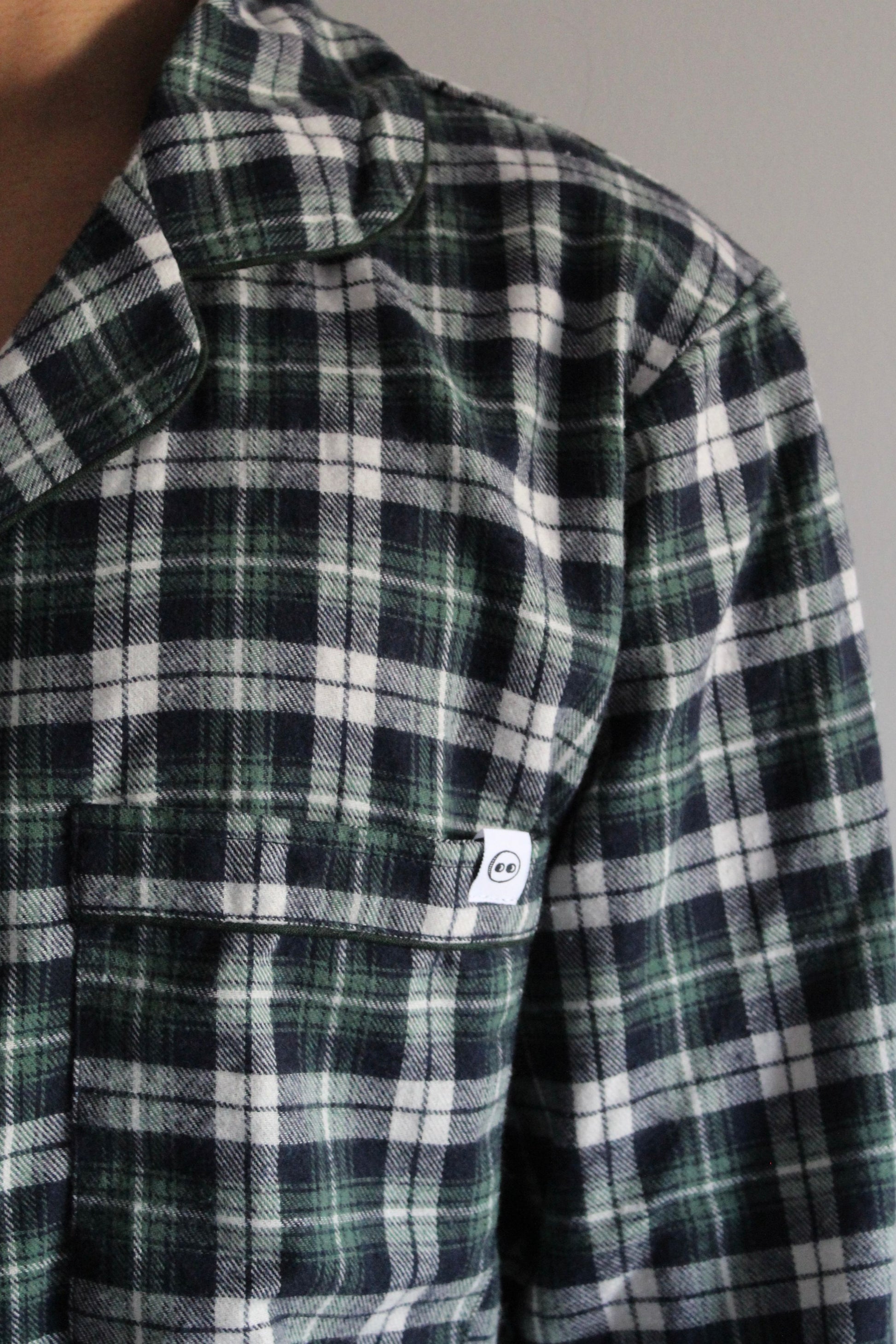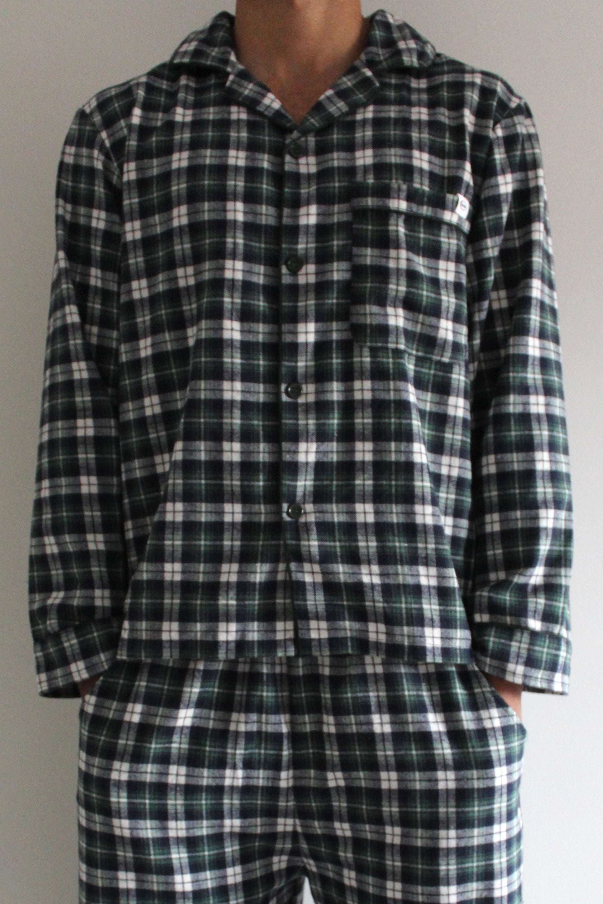 Featuring a deep forest green and navy checkered pattern, this set blends classic design with modern cuts. The shirt includes a chest pocket with the same embroidered detail.